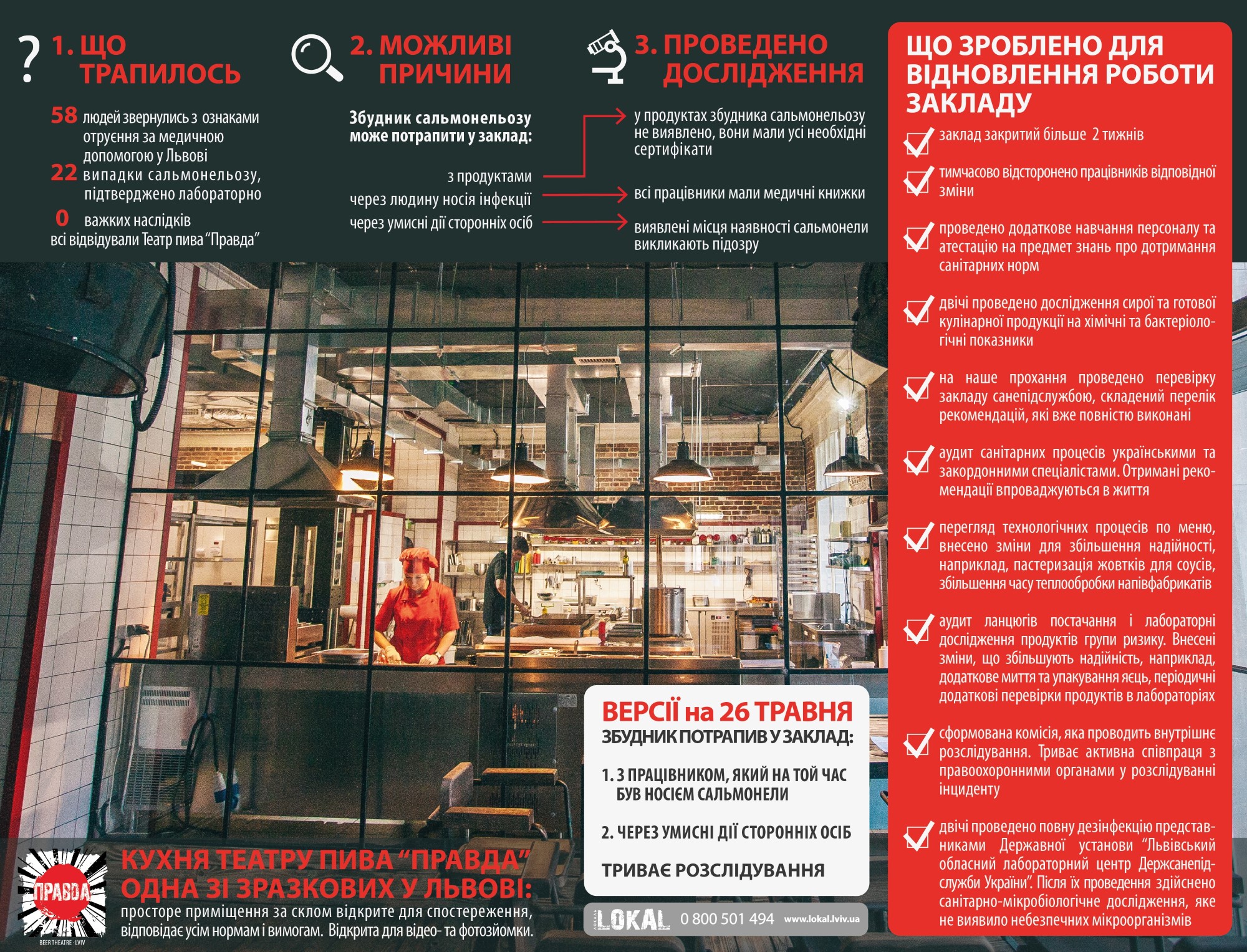 Театр пива “Правда” не працює уже більше двох тижнів. У закладі проведено всі необхідні санітарні заходи, в тому числі дві дезінфекції, повторні аналізи та дослідження. На момент отруєння людей у Театрі пива “Правда” уся продукція, яку кухарі використовували для приготування їжі, мала відповідні сертифікати. А працівники кухні — медичні книги.